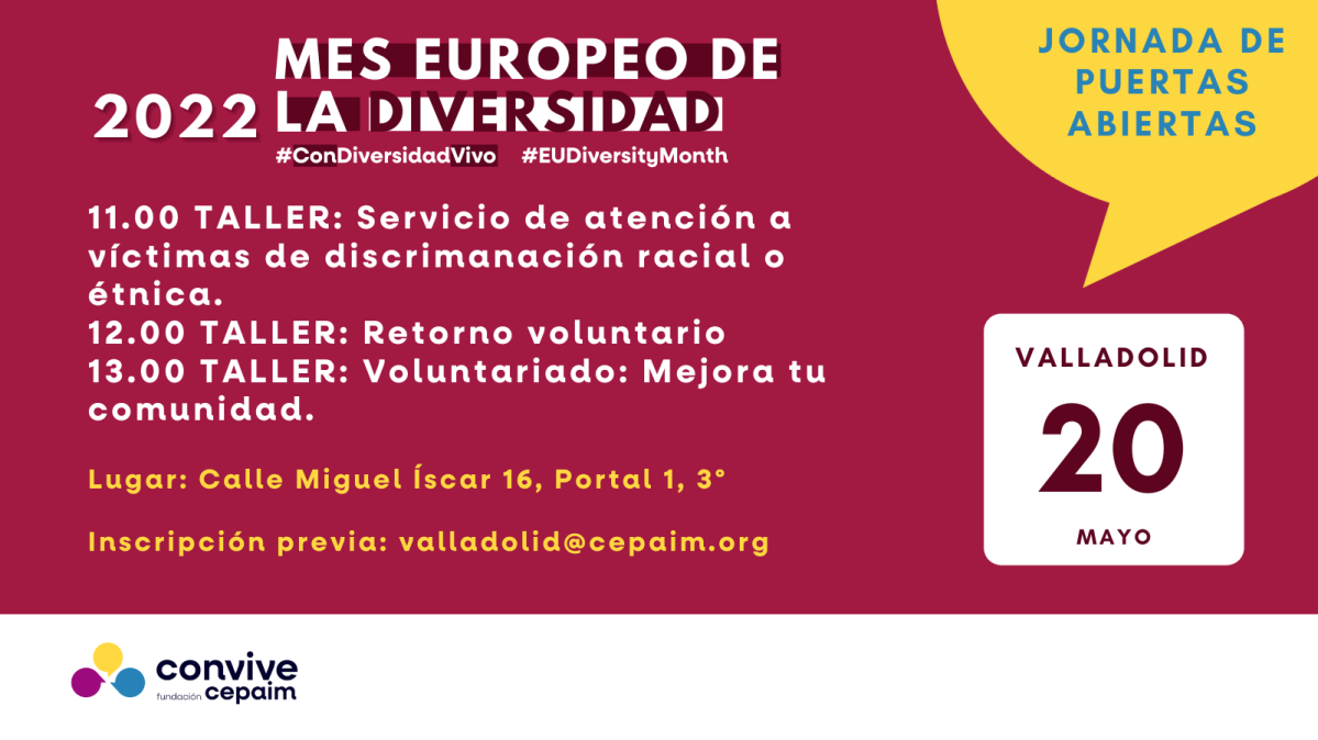 El próximo 27 de mayo el centro de Fundación Cepaim de Ciudad Real abre sus puertas para que las empresas y entidades colaboradoras puedan conocer mejor la actividad de Cepaim y compartan un momento de convivencia. Desde este centro queremos aprovechar la organización de esta jornada para sumarnos a la celebración del Mes Europeo de la Diversidad, una iniciativa de la Comisión Europea y de la plataforma Europea de Charteres de la Diversidad que se celebra por segundo año consecutivo y que tiene como objetivo celebrar y promover la diversidad en el lugar de trabajo.
