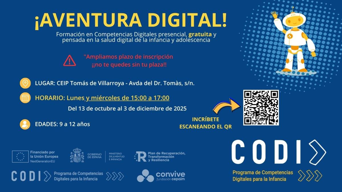 El proyecto CODI, financiado por el Ministerio de Juventud y Familia y la Unión Europea a través de los Fondos NextGeneration, promueve competencias digitales en infancia y adolescencia mediante itinerarios básicos (9-13 años) y avanzados (14-17 años), reduciendo la brecha digital con herramientas digitales, redes sociales, Inteligencia Artificial y ciberseguridad.