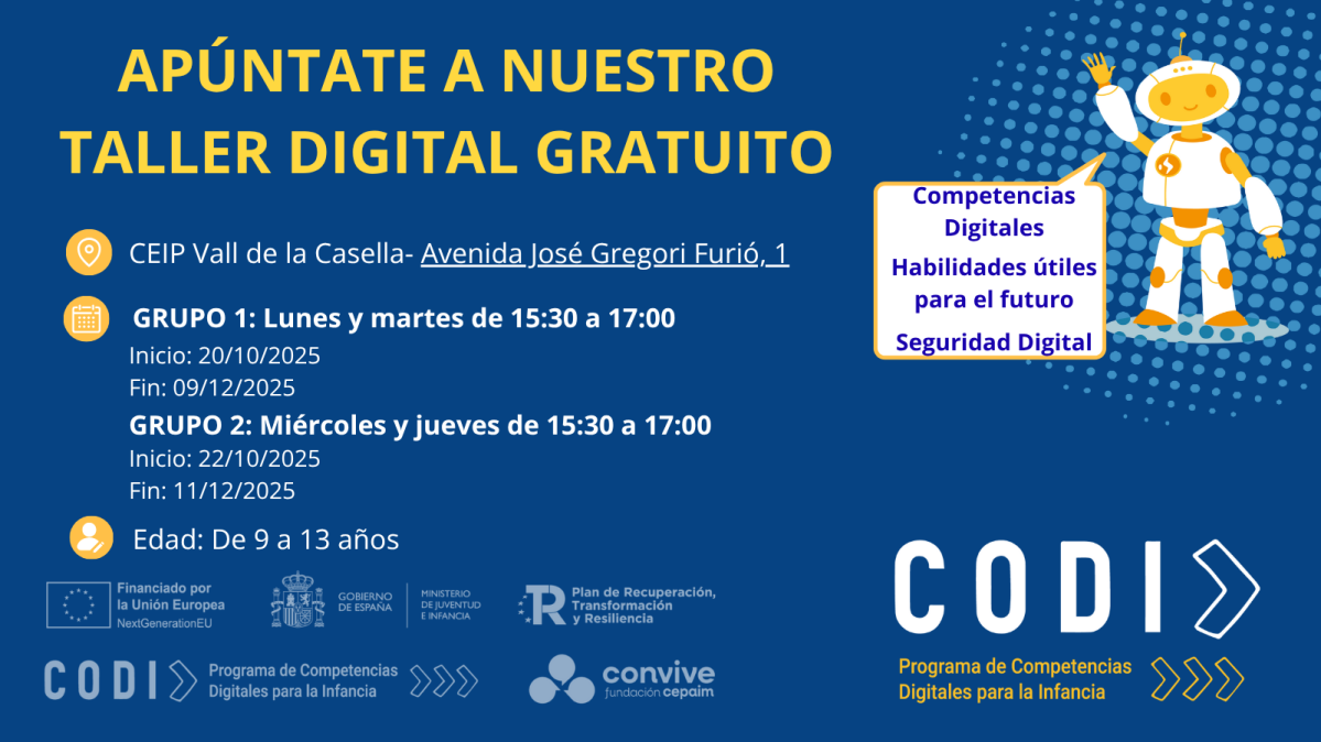 El proyecto CODI, financiado por el Ministerio de Juventud y Familia y la Unión Europea a través de los Fondos NextGeneration, promueve competencias digitales en infancia y adolescencia mediante itinerarios básicos (9-13 años) y avanzados (14-17 años), reduciendo la brecha digital con herramientas digitales, redes sociales, Inteligencia Artificial y ciberseguridad.