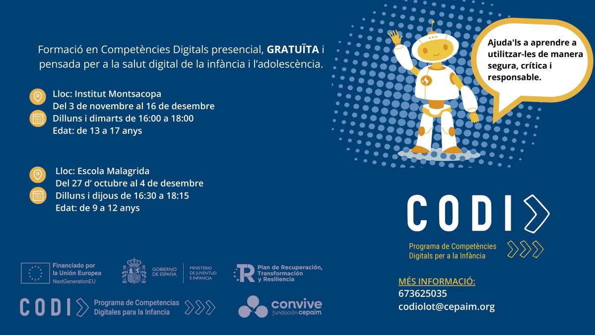 El proyecto CODI, financiado por el Ministerio de Juventud y Familia y la Unión Europea a través de los Fondos NextGeneration, promueve competencias digitales en infancia y adolescencia mediante itinerarios básicos (9-13 años) y avanzados (14-17 años), reduciendo la brecha digital con herramientas digitales, redes sociales, Inteligencia Artificial y ciberseguridad.