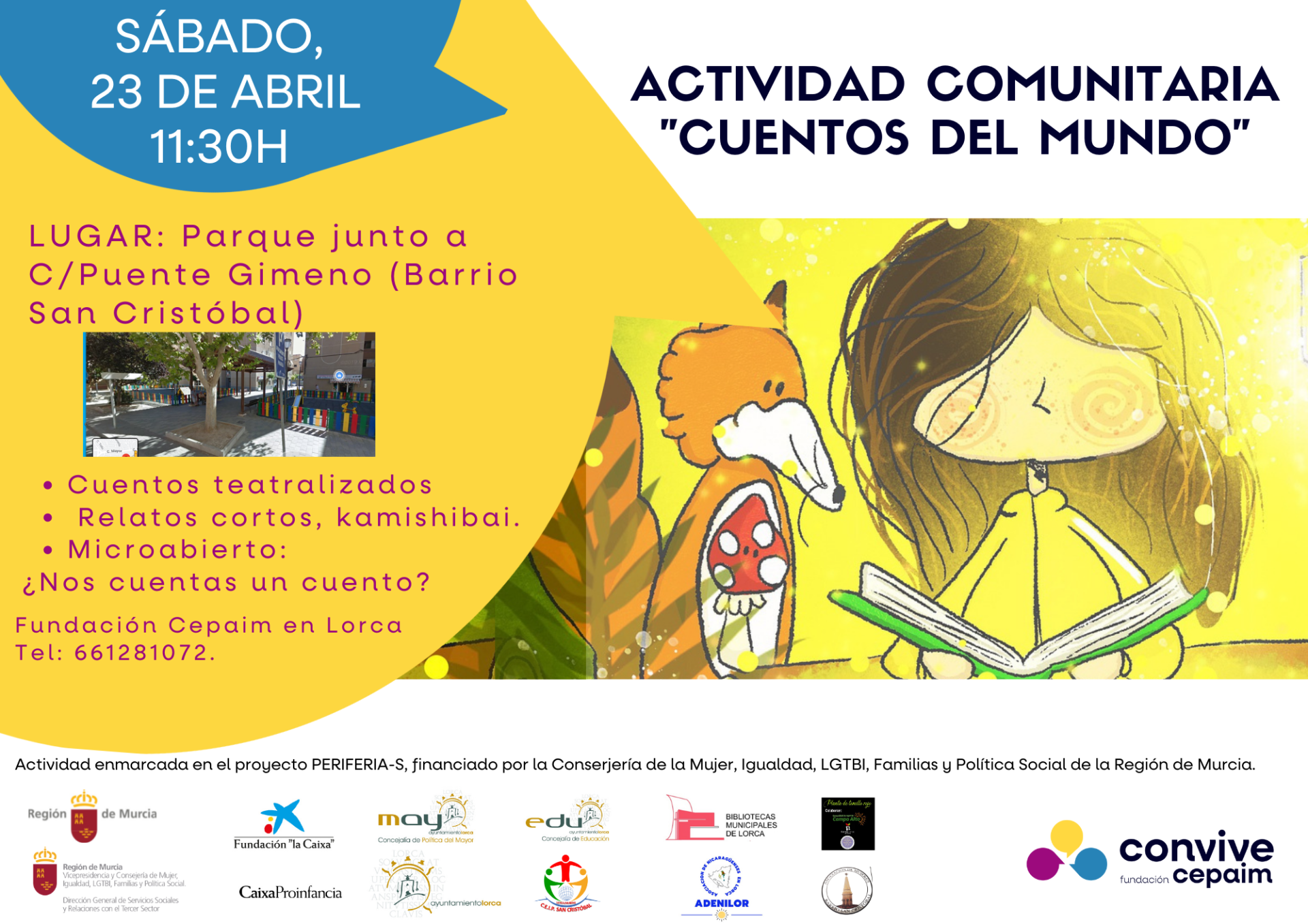 Esta cita es fruto del trabajo coordinado con el Ayuntamiento de Lorca, a través de la Biblioteca Municipal y la Concejalía del Mayor con los Abuelos Cuentacuentos, la Asociación de Mujeres del Barrio San Cristóbal, el Programa CaixaProinfancia desarrollado por Cepaim en los CEIP Juan González, San José y José Robles, Proyecto Desactivando el racismo y la xenofobia, ADENILOR (Asociación de Nicaragüenses de Lorca), CEIP San Cristóbal y vecinas de los barrios en los que nos ubicamos.