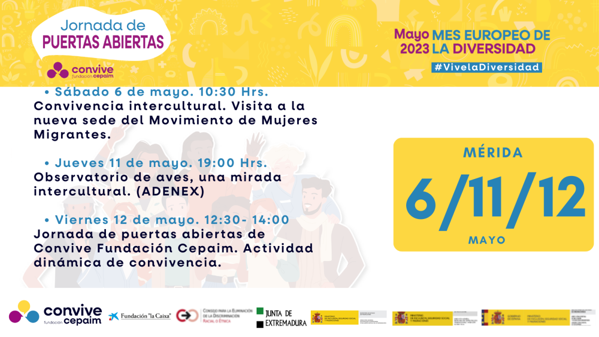 Desde el 6 hasta el 12 de Mayo 2023, en CONVIVE Fundación Cepaim en Mérida, realizaremos diferentes actividades en el marco de la semana de puertas abiertas de la entidad.