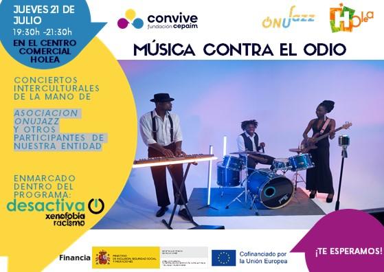 Concretamente, estaremos el próximo jueves 21 de Julio a partir de las 19:30h, llevando a cabo un espacio musical denominado “MÚSICA CONTRA EL ODIO”. Durante este evento, podremos disfrutar de conciertos interculturales en directo, ofrecidas por la Asociación Onujazz y otros participantes de nuestra entidad, que colabora activamente en esta jornada.